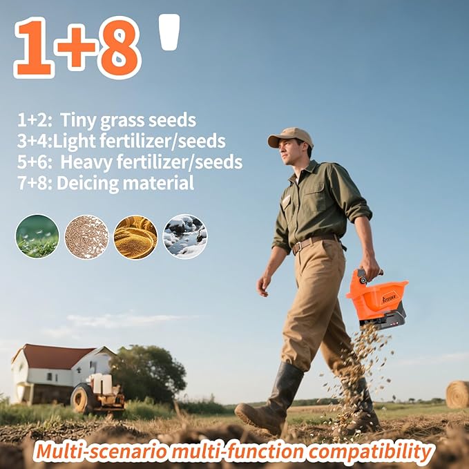 • 【8-Level Settings & 6 Seeding Angles for Precision】This grass seed spreader features 8 adjustable settings: Levels 1-3 are ideal for fine grass seeds, Levels 4-6 for moderate fertilizers, and Levels 7-8 for heavy rock salts. It also offers 6 seeding angles with a maximum of 125°, ensuring precise spreading.