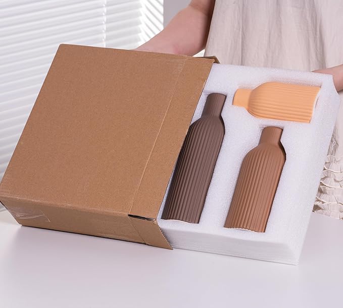 • Unique Ribbed Design : Featuring a distinctive ribbed texture and a warm brown finish ,these vases bring a modern yet timeless aesthetic to your home.The vertical grooves create a visually striking pattern , making them ideal for farmhouse ,pampas grass decor styles.(Length x Diameter=9.96 x 3.35", 7.87 x 3.31",5.79 x 3.31",the dimensions are all measured by hand, So there may be some small deviations.)