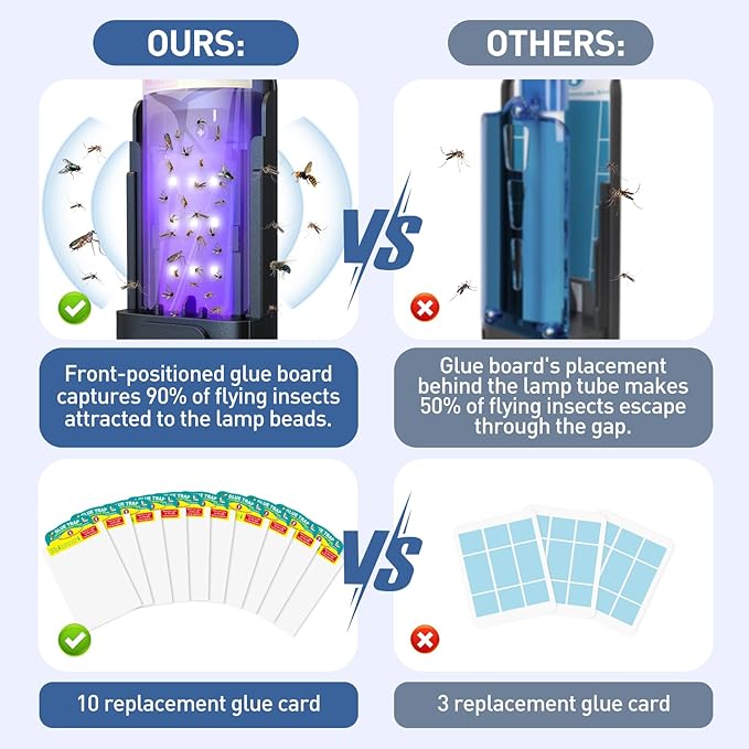 • 【Upgraded Fly Trap Indoor】Traditional fly traps have flaws: lamp-post type designs lose 50% capture rate due to gaps, while bottom-upward light types waste 50% of the divergent light. Our solution adds 9 LED lamp beads on the back-panel that diffuse puncture light onto a transparent glue board, so that the flying insects 90% can be trapped on the transparent glue board by the puncture light.