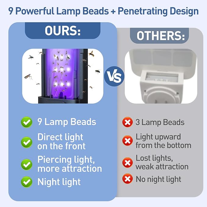 • 【Plug-in Insect Trap for Home】This indoor fly trap features 9 UV light beads that emit UVA light in the 365-395nm wavelength, attracting house flies, gnats, moths, fruit flies, and other flying pests. For best results, activate the UV light and minimize other light sources. Position the trap in a dark, enclosed space for optimal mosquito control.