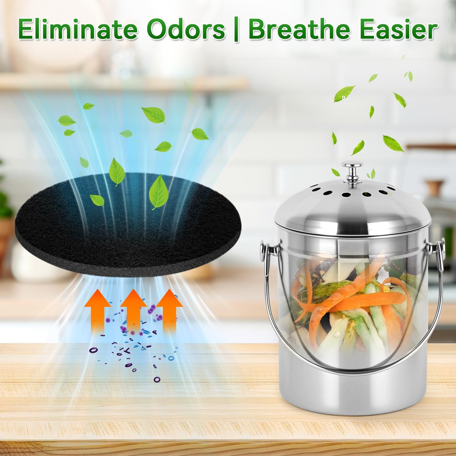 • Superior Odor Elimination: Our charcoal filters effectively absorb and neutralize odors in your compost bins or trash cans, keeping your kitchen naturally fresh and odor-free