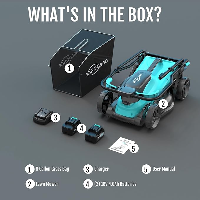 • 【All-Inclusive Package & Ready to Use】 Comes with everything you need: YARDCARE cordless lawn mower, 8-gallon grass bag, (2) 18V 4.0Ah batteries, charger, and user manual. Skip the trip to the store—unbox, charge, and start mowing in minutes.