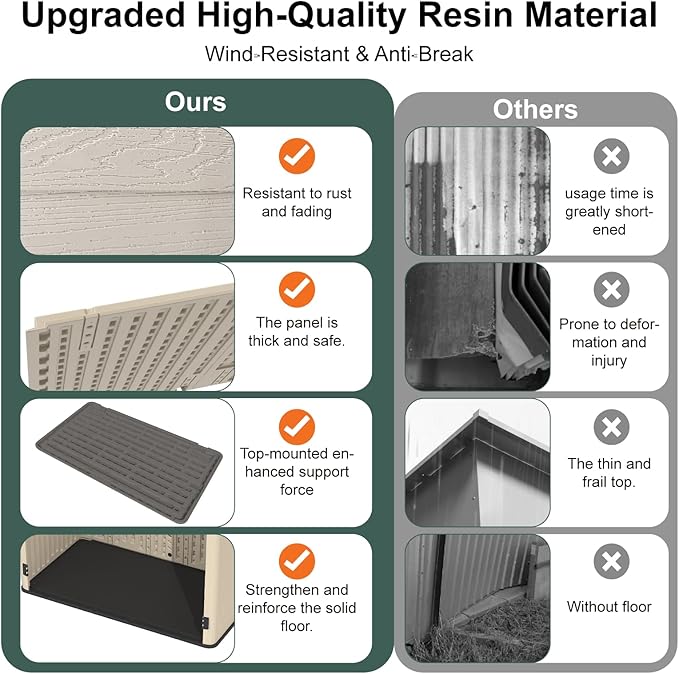 • All-Weather Resin Construction: Built with durable, waterproof resin, this shed withstands rain, snow, UV rays, and temperature fluctuations. The lockable, reinforced floor ensures the security of your property.