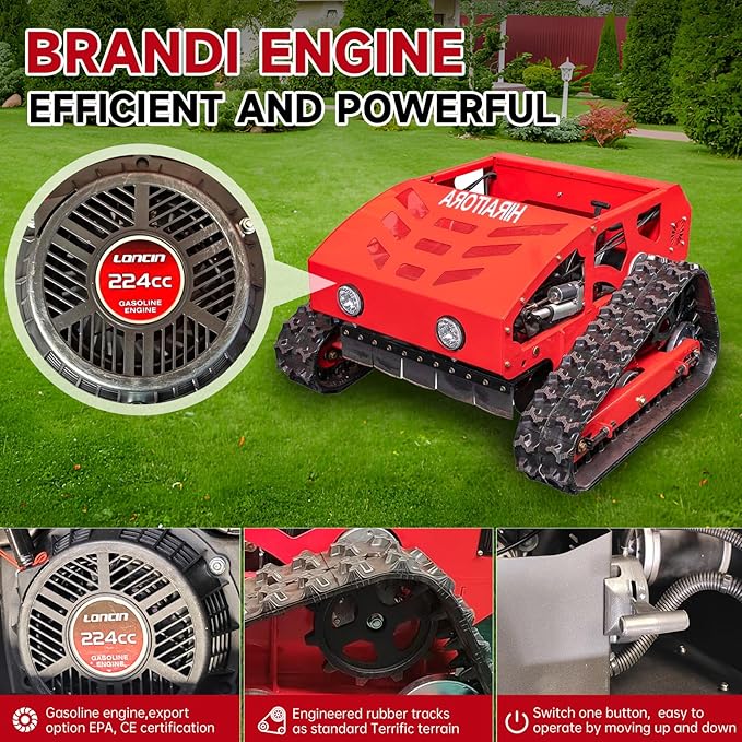 • Convenient Remote Control: Effortlessly start, stop, and steer your mower from a distance using the intuitive remote control, giving you ultimate convenience and flexibility.