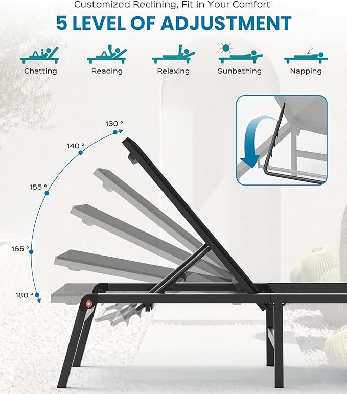 • 5-Position Adjustable Backrest - Experience ultimate comfort with our patio lounge chair’s five recline options. Whether you’re reading, napping, or simply relaxing, adjust the backrest from upright to fully reclined to find your perfect angle