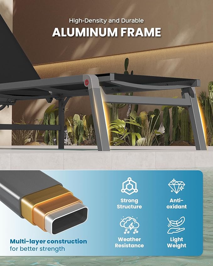 • Rust-Resistant Aluminum Frame - Built with a durable aluminum frame covered in an anti-rust powder coating, this pool lounge chair withstands outdoor elements. Its robust design provides longevity and low maintenance for carefree outdoor relaxation