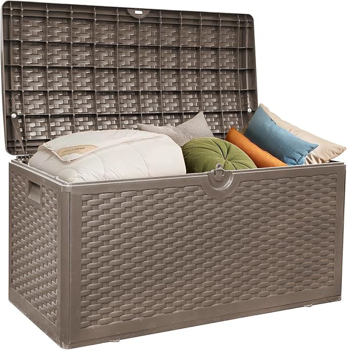 • Built to withstand any weather, our deck box is made from resin that offers waterproof, corrosion-resistant protection, and UV-resistant. No matter the season—be it scorching sun or heavy rain—this box will keep your items dry .