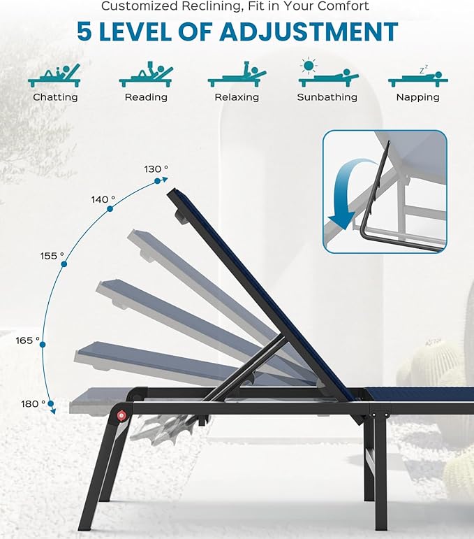 • 5-Position Adjustable Backrest –Experience ultimate comfort with our patio lounge chair’s five recline options. Whether you’re reading, napping, or simply relaxing, adjust the backrest from upright to fully reclined to find your perfect angle
