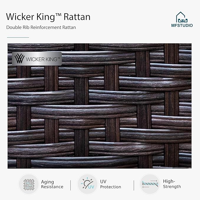 • Wicker & Iron Furniture Combo: Combine style and comfort with our rattan wicker and iron design. The charming wicker gives your space a natural beauty, while the solid iron frame provides stability and support. This heavy-duty furniture is built to last, ready to withstand outdoor weather season after season