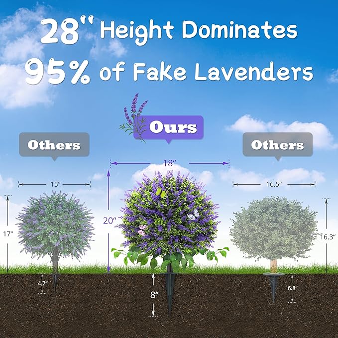 • 【Premium 28" Height, Superior Presence】At 28 inches, our tall artificial shrub ball surpasses 95% of fake lavender plants in market height while maintaining perfect proportions. The artificial outdoor faux plants with a full and rounded canopy creates dramatic impact without overwhelming patio planters or indoor spaces