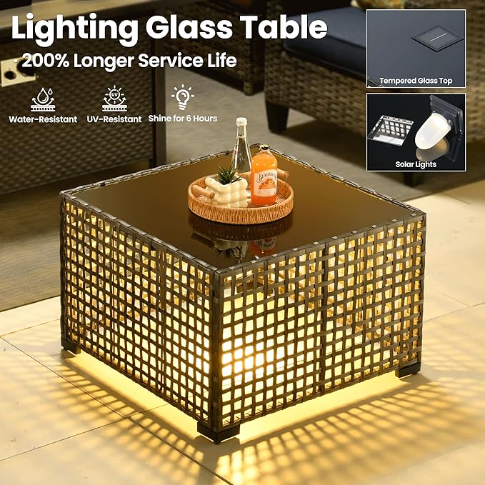 • Solar-Powered Light Table: The uniquely designed coffee table features built-in solar panels that automatically charge by day and emit warm, inviting light at night, it creates the perfect ambiance for evening gatherings while offering convenient space for drinks and snacks