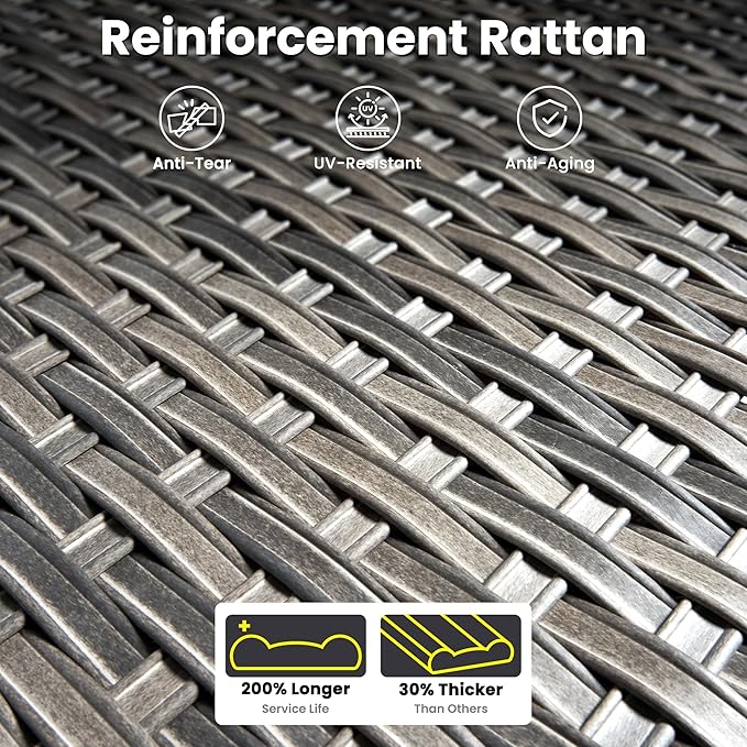 • All-Weather Rattan: Crafted from handwoven premium PE wicker with intricate handwoven detailing, this set is UV-resistant, waterproof, and built to withstand sun, rain, and wind. Its durable construction ensures long-lasting beauty without fading or cracking