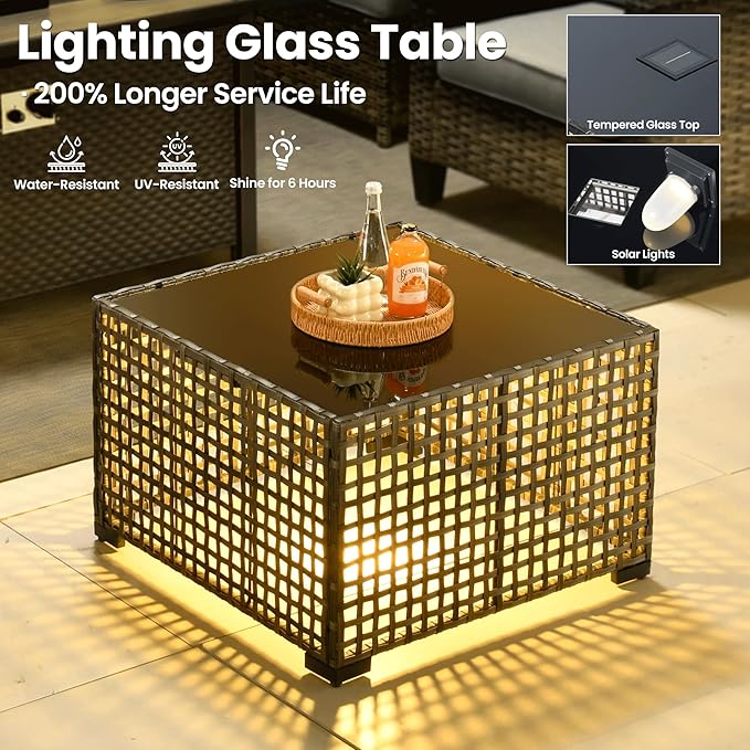 • Solar-Powered Light Table: The uniquely designed coffee table features built-in solar panels that automatically charge by day and emit warm, inviting light at night, it creates the perfect ambiance for evening gatherings while offering convenient space for drinks and snacks