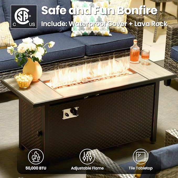 • Outdoor Fire Pit Table: Patio gas propane fire table has 55000 BTU of heat output with CSA certification. Features a safe ignition system, adjustable flame control, and a user-friendly switch panel for effortless operation, perfect for bonfire night, backyard party, outdoor dining, poolside relaxation, campfire and cool evenings