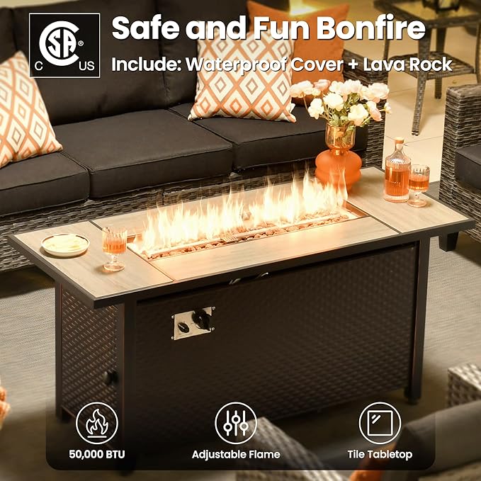 • Outdoor Fire Pit Table: Patio gas propane fire table has 55000 BTU of heat output with CSA certification. Features a safe ignition system, adjustable flame control, and a user-friendly switch panel for effortless operation, perfect for bonfire night, backyard party, outdoor dining, poolside relaxation, campfire and cool evenings