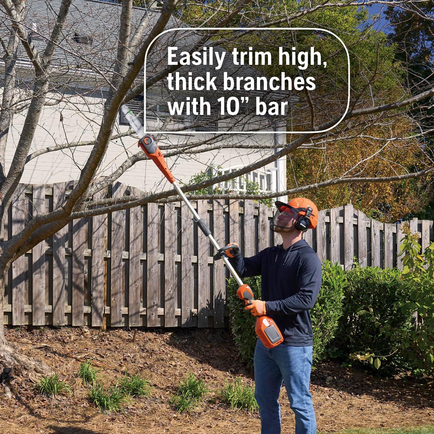 • EASY, COMPACT STORAGE: Battery pole saw attachment includes storage hook, making it easy to hang alongside other landscaping tools and lawn equipment