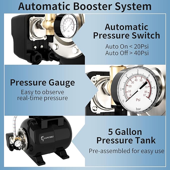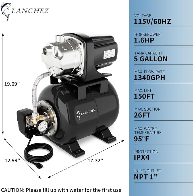 LANCHEZ 1.6HP Shallow Well Pump with Pressure Tank, 1340GPH Automatic Irrigation Water Booster Jet Pump, 115V Stainless Steel Water Transfer Pump for Home Garden Lawn Sprinkler Irrigation