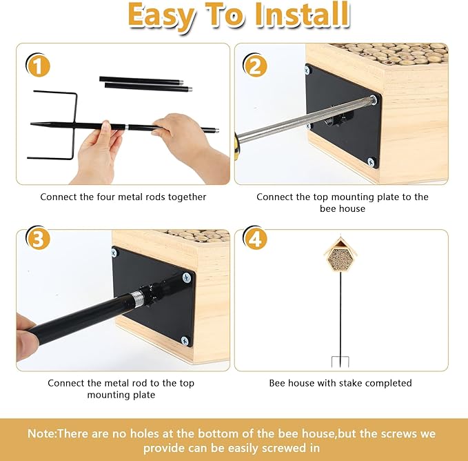 • Easy to install:package include 1pcs mason bee House with a top hook and 1pcs metal ground stake(Includes 4 screws for installation); bee house Size:8.6x8.4x3.9inch; 3installation ways: you can stand the bee house among the flowers, place it on the grass, or hang it under the trees according to the garden layout; the three-piece base can stand firmly in the soil without worrying about being affected by bad weather