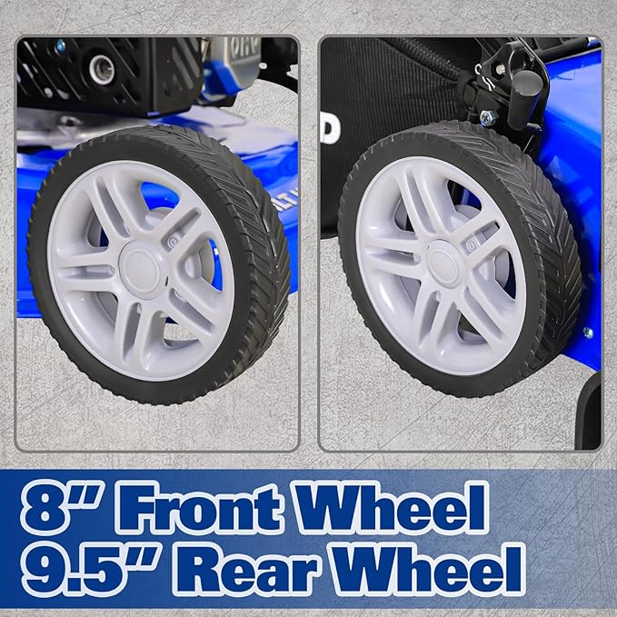 • Effortless Yard Maintenance - Equipped with smooth-rolling 9.5" rear wheels and 8" front wheels, both featuring double ball bearings, the mower moves effortlessly across your yard. The comfortable foam-wrapped, angled handle reduces hand fatigue, making lawn maintenance a breeze.