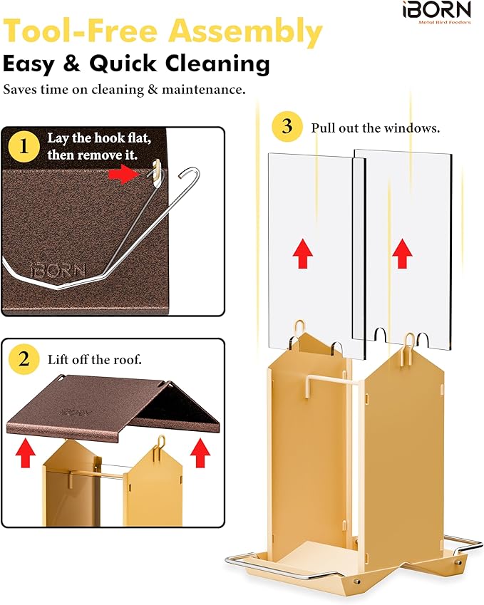 • 【Fully Detachable Design,Easy to Clean & Refill】iBorn squirrel proof bird feeders features a removable roof, foldable perches, and a wide opening for quick filling and effortless cleaning. The clear PC window lets you check seed levels at a glance. Every part is accessible — clean with just your hands, a brush, or towel. No hidden corners, no hassle. Perfect for bird lovers who want to enjoy nature without the mess.