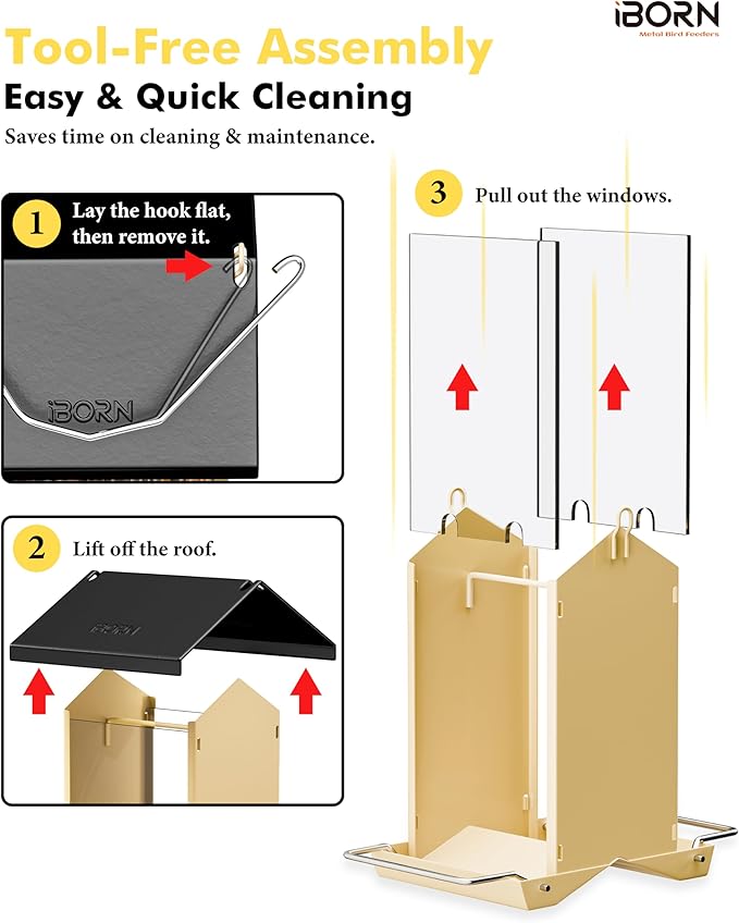• 【Fully Detachable Design,Easy to Clean & Refill】iBorn squirrel proof bird feeders features a removable roof, foldable perches, and a wide opening for quick filling and effortless cleaning. The clear PC window lets you check seed levels at a glance. Every part is accessible — clean with just your hands, a brush, or towel. No hidden corners, no hassle. Perfect for bird lovers who want to enjoy nature without the mess.