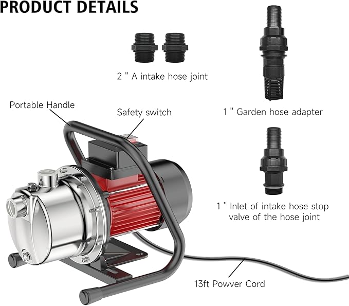 • WHAT'S INCLUDED-This shallow well pump includes 1 rawl strap, 2 hoops, 1 1'' intake hose fitting, 2 1'' garden hose adapters, 1 1'' intake hose check valve for hose fitting . Our team is available 24/7 to assist you with any questions or concerns you may have. Rest assured that we pride ourselves on providing excellent customer support.