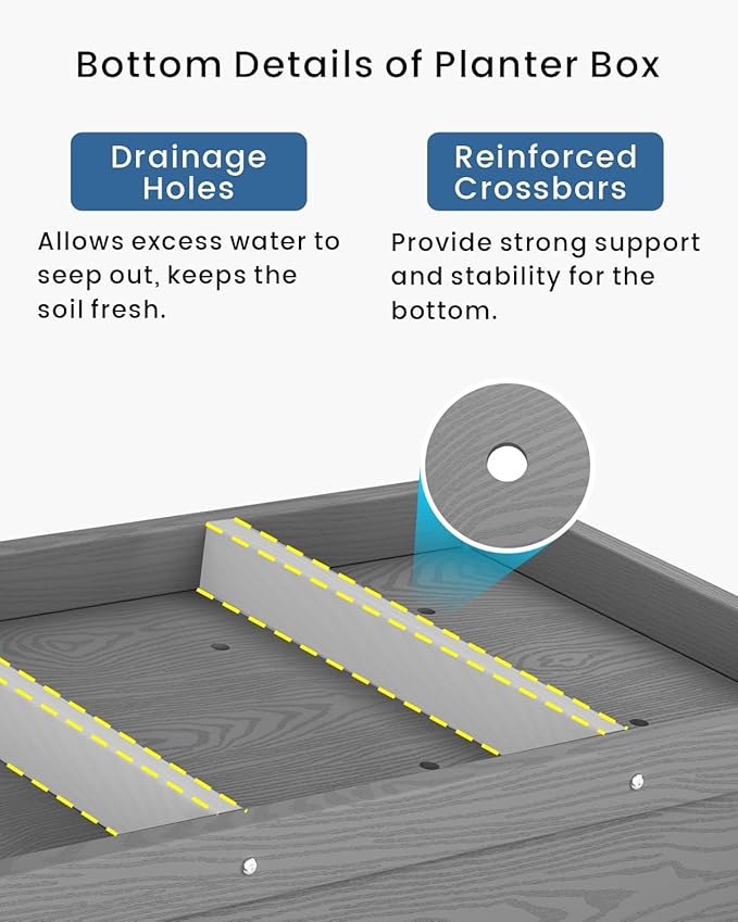 • Drainage System: This planter box is equipped with drainage holes at the bottom to allow excess water to drain out, keeping the soil fresh. Two reinforcing crossbars provide added support, preventing the bottom from detaching.