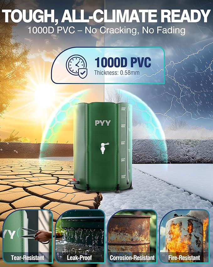 • ๐ƒ๐ฎ๐ซ๐š๐›๐ฅ๐ž & ๐’๐ญ๐ฎ๐ซ๐๐ฒ: Our rainwater collection barrel is made from high quality 0.5mm thick 1000D PVC, lead-proof, corrosion-resistant, sun-resistant, and crack-resistant. Equipped with 6 robust legs of 1.5mm thickness, the rain storage barrel holds 100 gal water steadily. Enjoy the convenience of irrigation or cleaning in various areas, while our rain water catcher withstands the test of time.