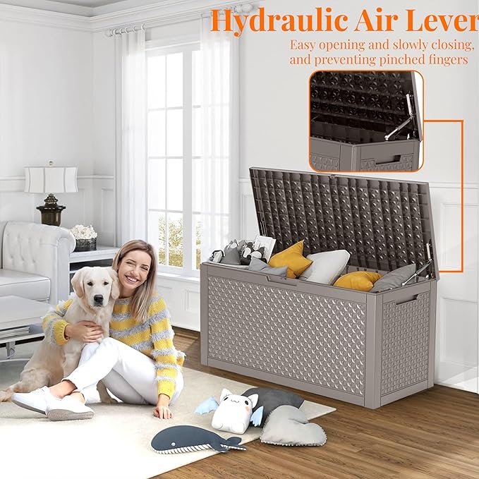 • TRANSFORM YOUR SPACE: Whether used indoors as a laundry storage solution or outdoors for patio items like cushions, garden tools, this patio storage box excels. Its multi-functional design makes it suitable as a side table, patio seat, storage bench, or footstool