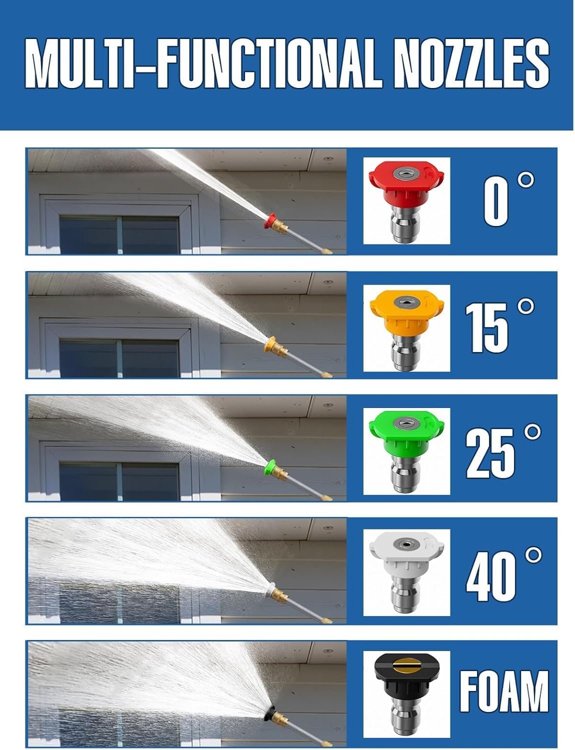 • MULTI-FUNCTIONAL NOZZLES: The water hose nozzle high pressure is equipped with 5 switchable nozzles, 0° high-pressure water jet is suitable for cleaning moss in the floor cracks, 15° can be used for car wash, 25° nozzle - ground cleaning, 40° - window cleaning, 60 ° - yard dusting, easy to deal with the whole scene.