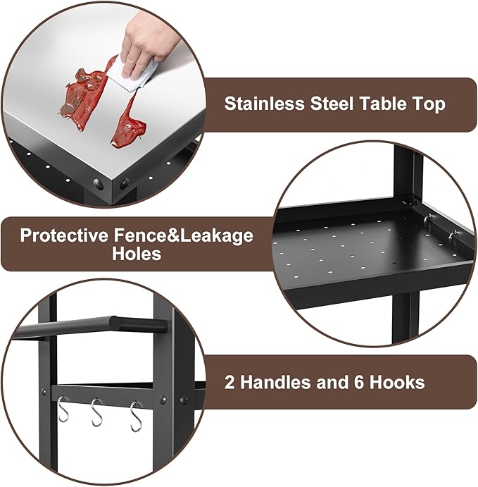 • Humanized Design: Our outdoor prep table has 2 handles and 6 hooks. You can move it in any direction and there are places for kitchenware and towels on both sides. The second shelf takes plates slipping off and accumulated water into consideration, which comes out the shelf with fences and weep holes.