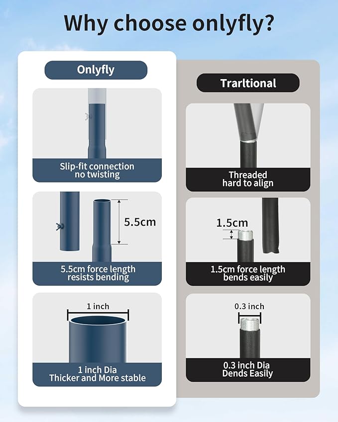 • 【Long-Lasting Stability】The 5-prong base features a reinforced weld design for solid ground support, preventing breakage and ensuring durability. The thicker pole, 1-inch diameter and 1mm thickness, connects via a slip-in method for a depth of up to 5.5 cm between poles. This design is much stronger than the 1cm threaded connections, offering improved resistance to bending and breakage. It provides ample weight capacity, perfect for enduring storms, winter snow, and multiple bird feeders.