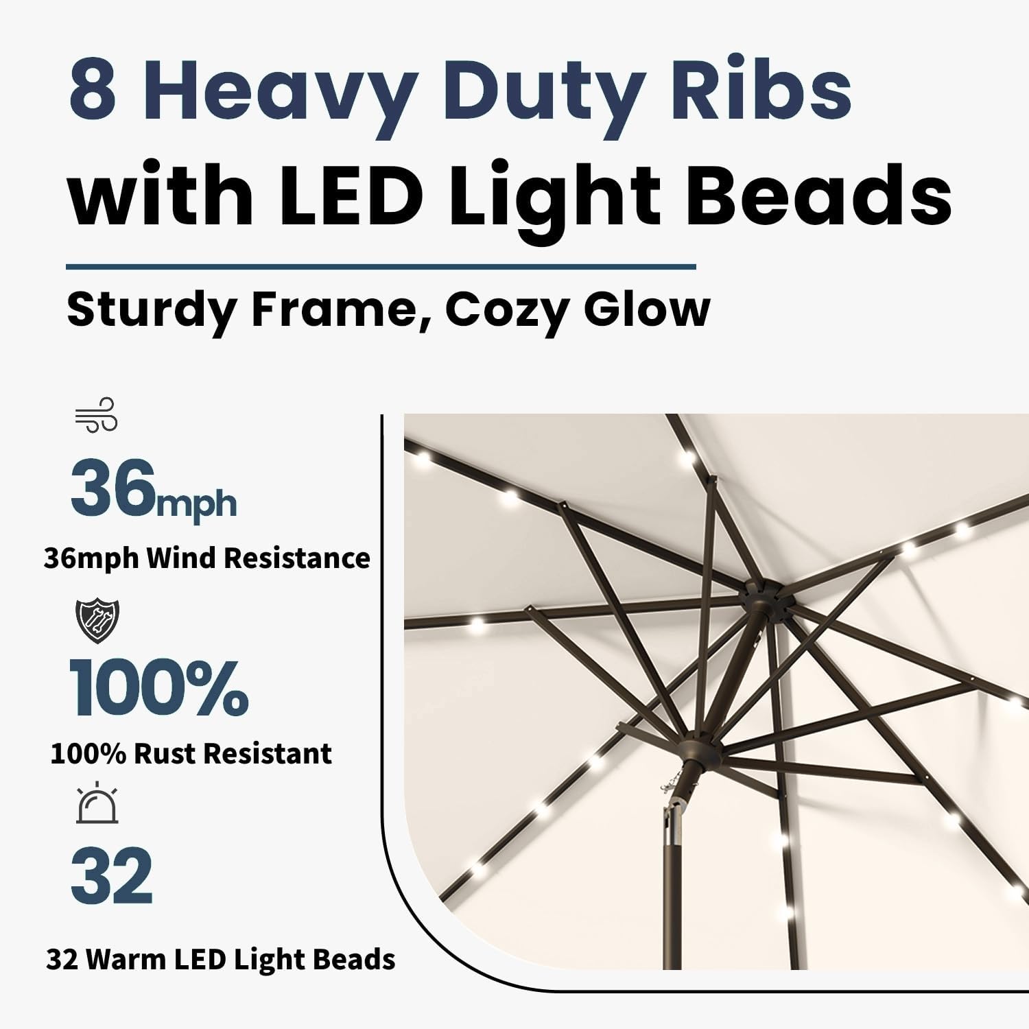 10FT Solar Umbrella 32 LED Lighted Patio Umbrella Table Market Umbrella w/Tilt and Crank, UV-Resistant Outdoor Umbrella for Pool, Garden, Deck, Creamy White