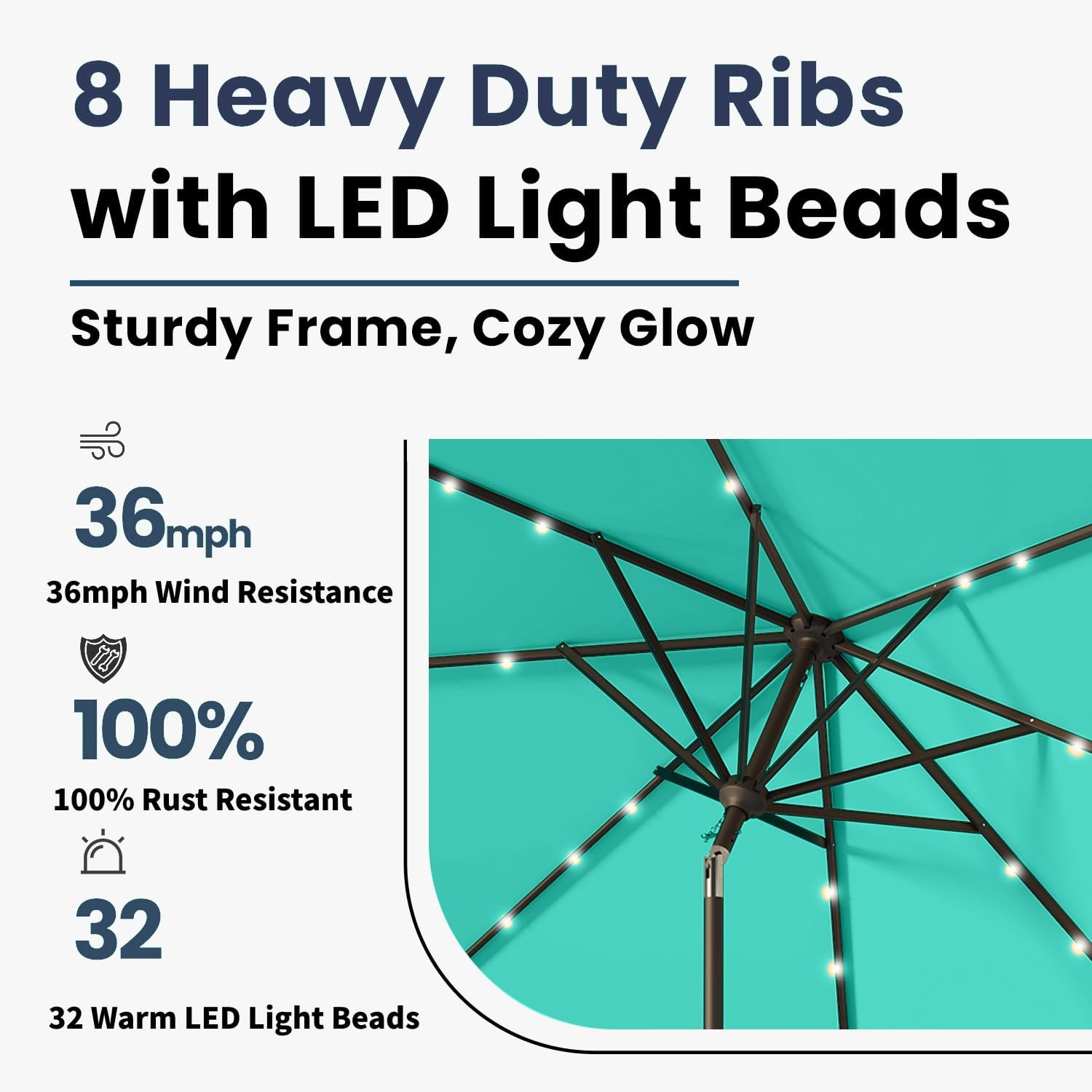 • 32 Solar-Powered LED Lights: Illuminate your evenings with 32 built-in LED lights powered by a high-efficiency solar panel, without the need for external power sources, providing up to 8 hours of ambient lighting.