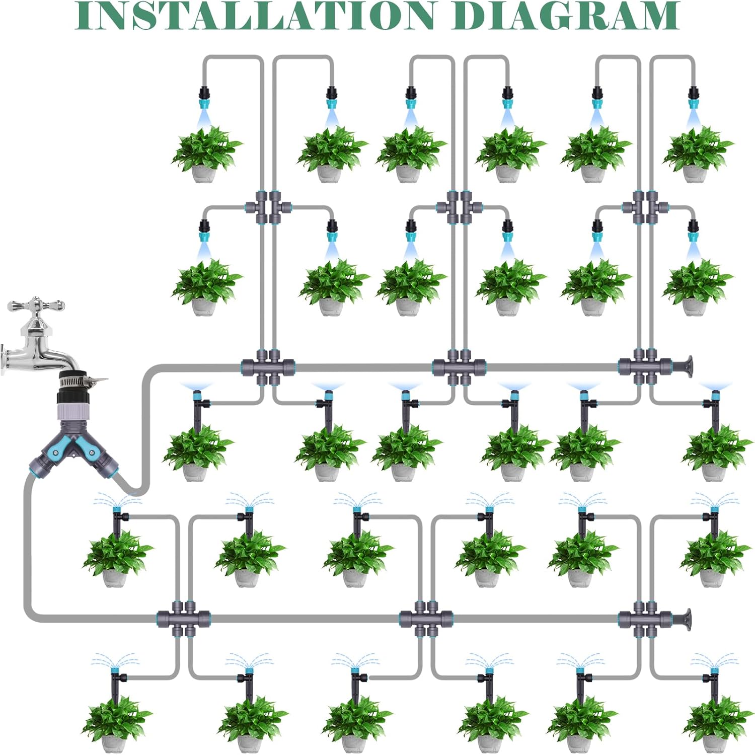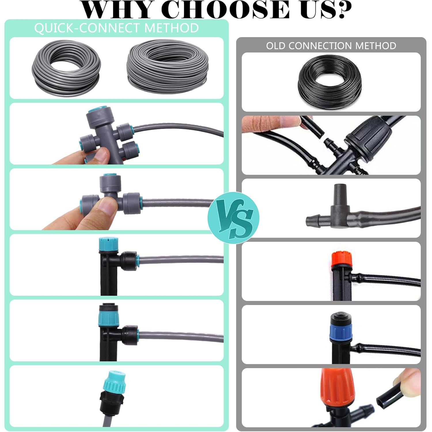 • 【Plug & Play with Quick Connect Design】Say goodbye to complicated installations—this drip irrigation system features quick-connect fittings that snap together effortlessly, ensuring a leak-proof and secure connection. The included six-way, and tee connectors allow you to design the perfect layout for raised beds, potted plants, or greenhouse irrigation systems.