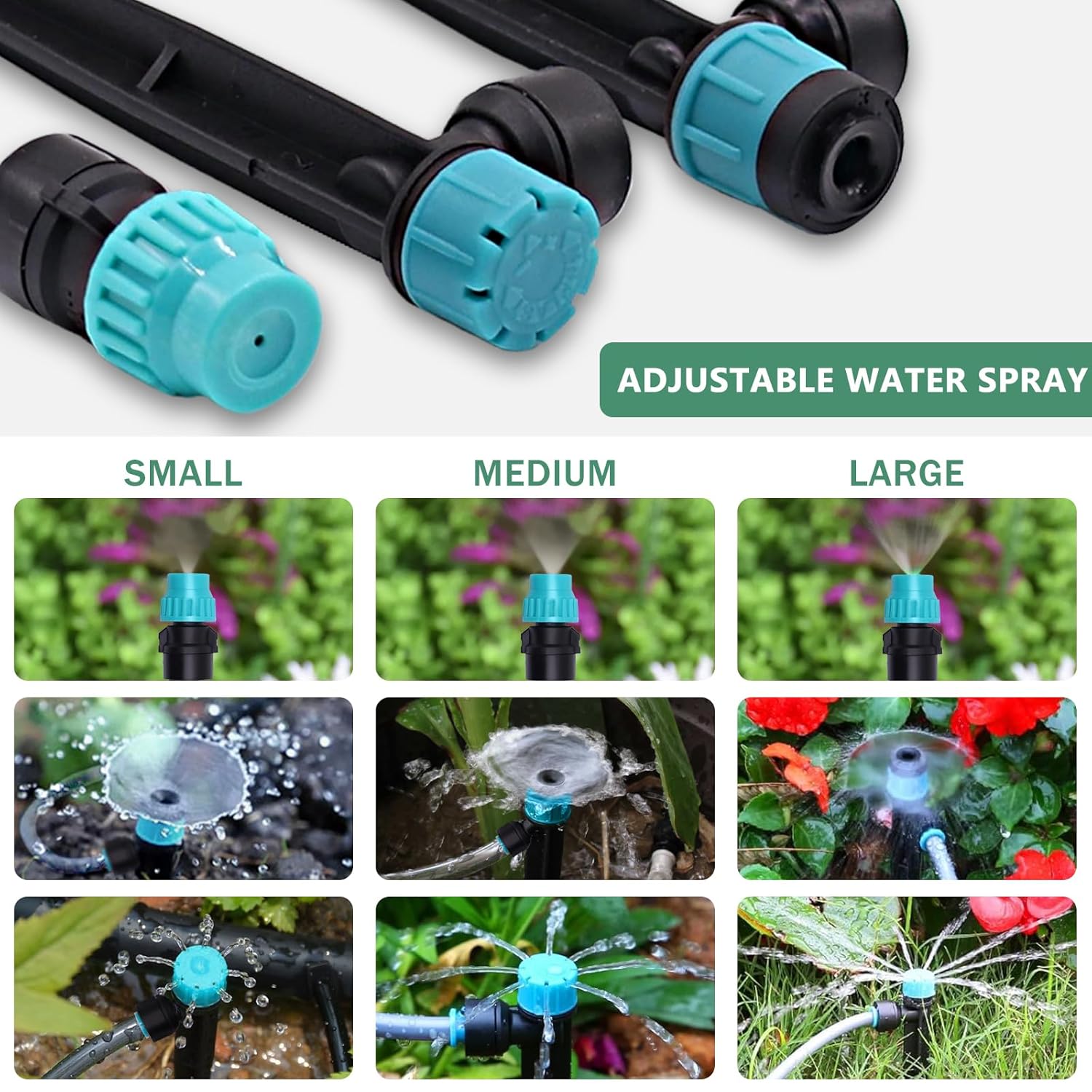 • 【Adjustable Sprayer for Versatile Use】The irrigation system delivers targeted hydration right to the root zone. Our micro drip irrigation kit comes with 3 types of sprayers( microdroplets, sprays, watering), each with individual adjustable nozzles that cater to different watering needs. This feature makes our irrigation system versatile, perfect for a variety of settings such as lawns, patios, greenhouses, and vegetable gardens.