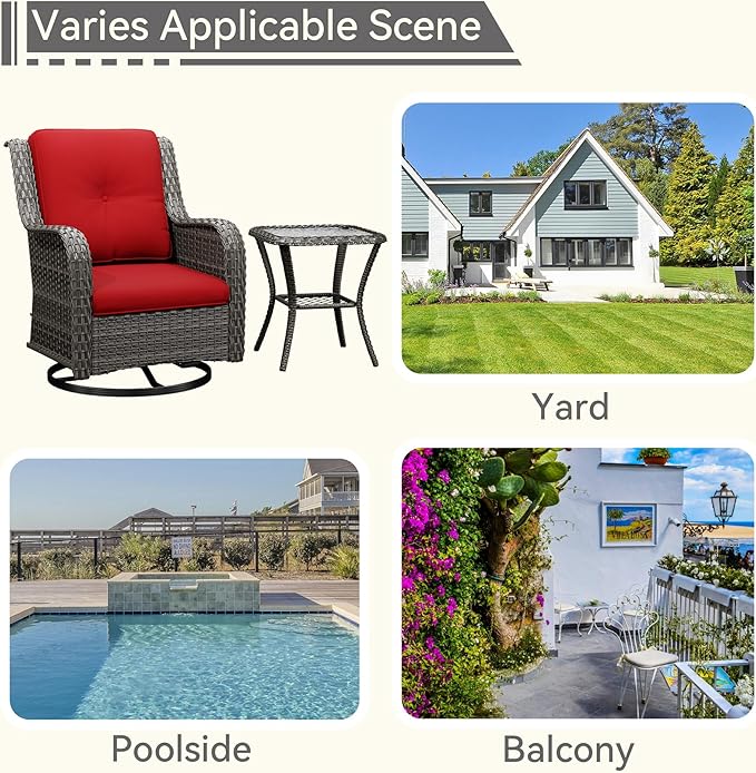 • [Specification Dimension] 31"Wx32"Dx36" H Patio Swivel Rocker Chair. Per Weight Capacity: 250-300 LBS. 20"Wx20"Dx22" H Side Table. Measured manually, which may allow minor errors