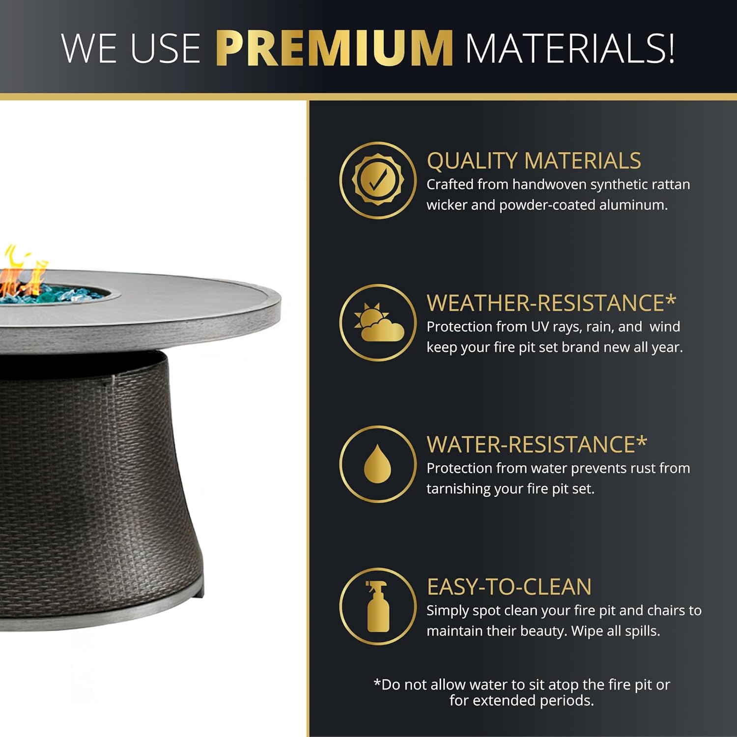 • 【Premium All-Weather Materials】Designed for durability, our aluminum patio furniture set features solid rust-proof aluminum frames and hand-woven fade-resistant resin wicker that withstands sun, rain, and changing weather conditions. The gas fire pit table and matching chairs maintain their elegance season after season. Backed by a 3-year limited warranty covering manufacturing and shipping defects for your peace of mind.