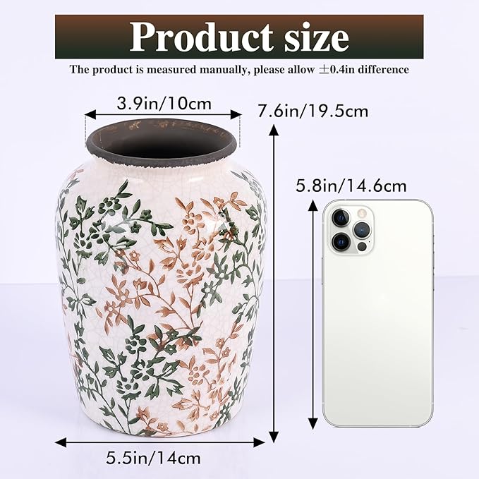 • Rustic flower vase: This porcelain vases measures approximately: 8.3 inches high, 5.5 inches in diameter/21*14 cm, can be used to display fresh or artificial flowers on shelves, mantels, tables or other surfaces, adding charm to living rooms, dining rooms, bedrooms, etc.