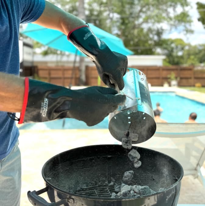 • Extended 18″ Gauntlet Cuffs: Extra-long cuffs guard your wrists and lower arms against burns and splatter. The 14-inch sleeve design provides comprehensive forearm protection when reaching deep into smokers, ovens, or over large grill surfaces. Tackle rotisserie, open-fire, or turkey frying with confidence and no fear of singed arms.