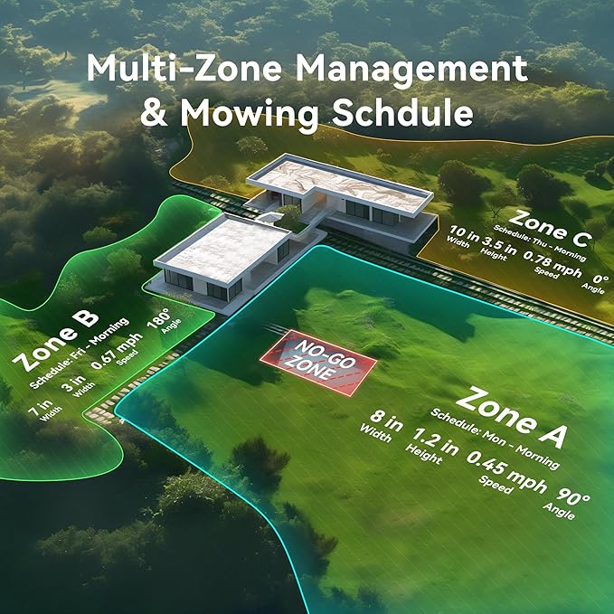 • 【1 Acre. Yes. Just One Mower】Thanks to powerful vision and spatial fusion technology, the mower can "understand" its surroundings like human eyes. It supports edge mapping of up to 1 acre (43,560 sq.ft / 4000㎡) and ensures consistently centimeter-accurate positioning. Users can customize multiple working areas via the app and define no-go zones such as pools, flower beds, and play areas, all of which are accurately recognized. Daily lawn care becomes effortless with the schedule function.