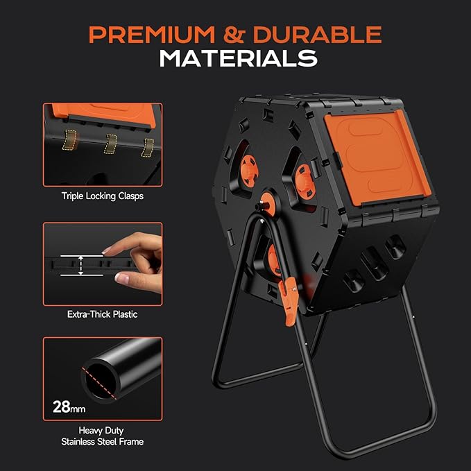 • 【Built Tough for All Seasons】Built for relentless seasons. Reinforced, extra-thick plastic walls prevent barrel collapse in this garden compost bin, supported by a 28mm stainless steel frame. Your heavy-duty outdoor compost bin withstands harsh elements