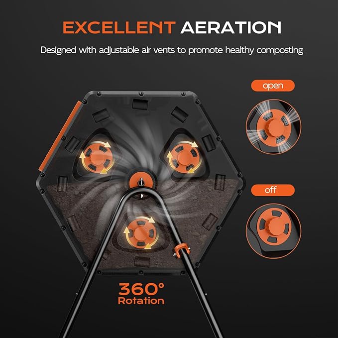 • 【Smart Ventilation Control】The compost tumbler features adjustable vents to regulate moisture, oxygen & temperature. Easily open/close them to manage moisture, oxygen, and temperature. Prevent odors during active phases or retain heat for faster breakdown