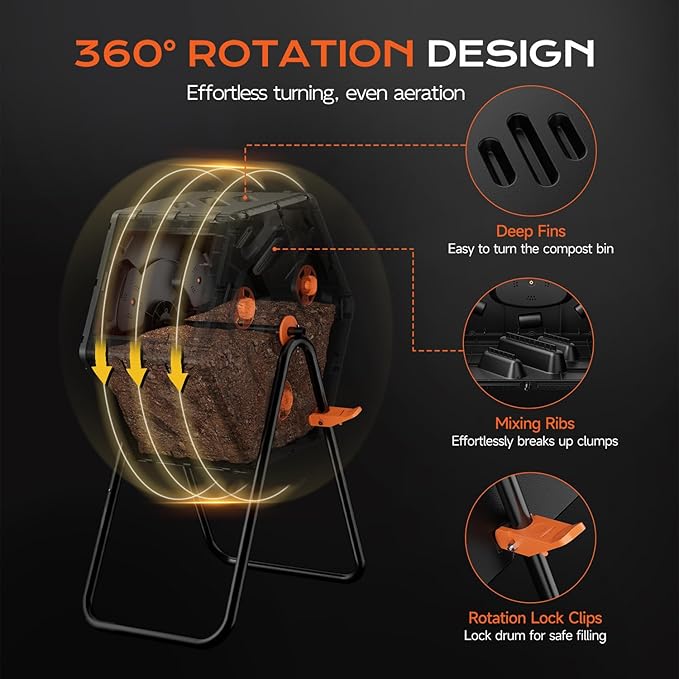 • 【Effortless 360° Tumbling】Simply rotate the outdoor compost bin 360° using the deep-grip grooves. Built-in mixing ribs break up clumps and aerate materials thoroughly – no manual turning required. Side-mounted rotation lock clips securely hold the drum for safe filling and unloading