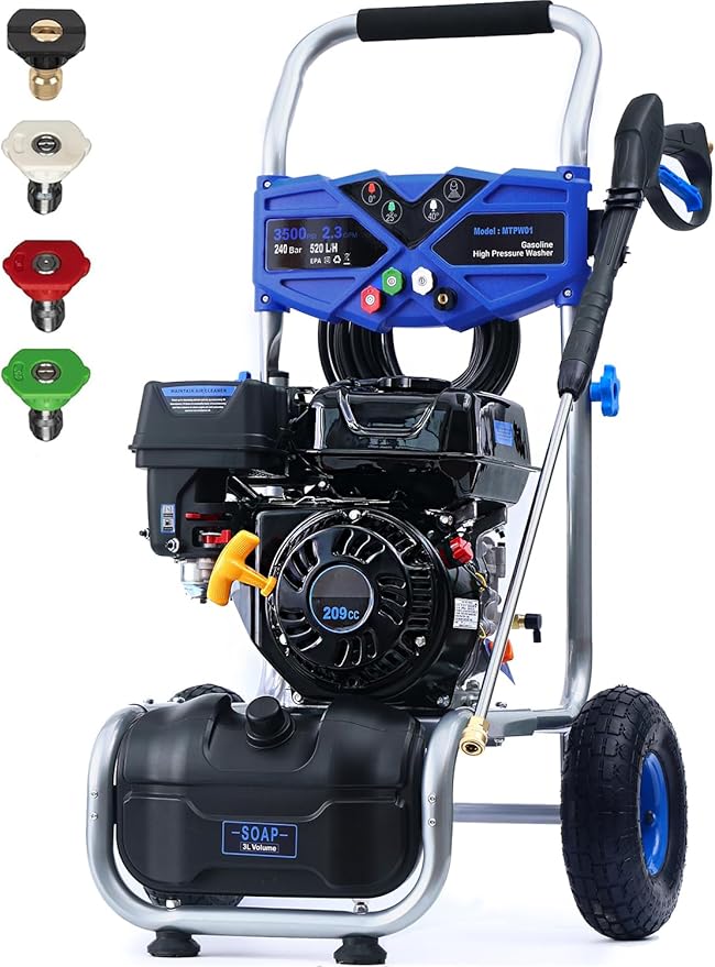 Gas Pressure Washer 3500 PSI 2.3 GPM, Power Washer with 209CC Engine, 25FT Hose, 4 Nozzles, High Pressure Cleaner for Cars, Driveways, Patios, Fences, Home Outdoor Cleaning