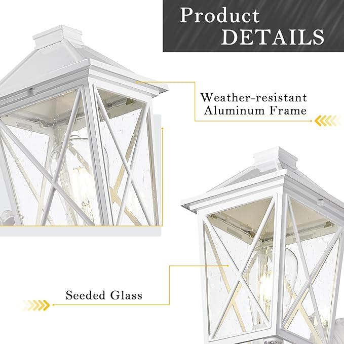 • Rust Resistant Wall Mounted Porch Light : Wall sconce with seeded glass and white finish, making charming Iighting effects ,ideal for various outdoor spaces, these patio wall lights beautifully retro styles. Perfect for frontdoor,porch, doorway, garage, backyard, hallway, patio, foyer, and entryway.