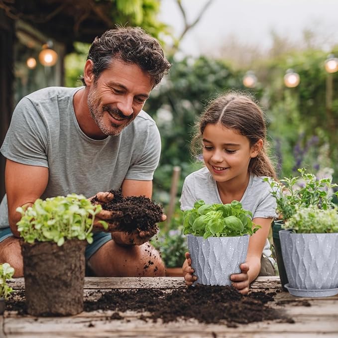 • 【Plant Pots with Drainage Holes and Trays】Plastic plant pot features drainage holes that promote proper air circulation for roots, ensuring healthy growth and preventing waterlogging, small uniform holes prevent soil leakage. While the matching saucers catch excess water to keep surfaces clean and dry