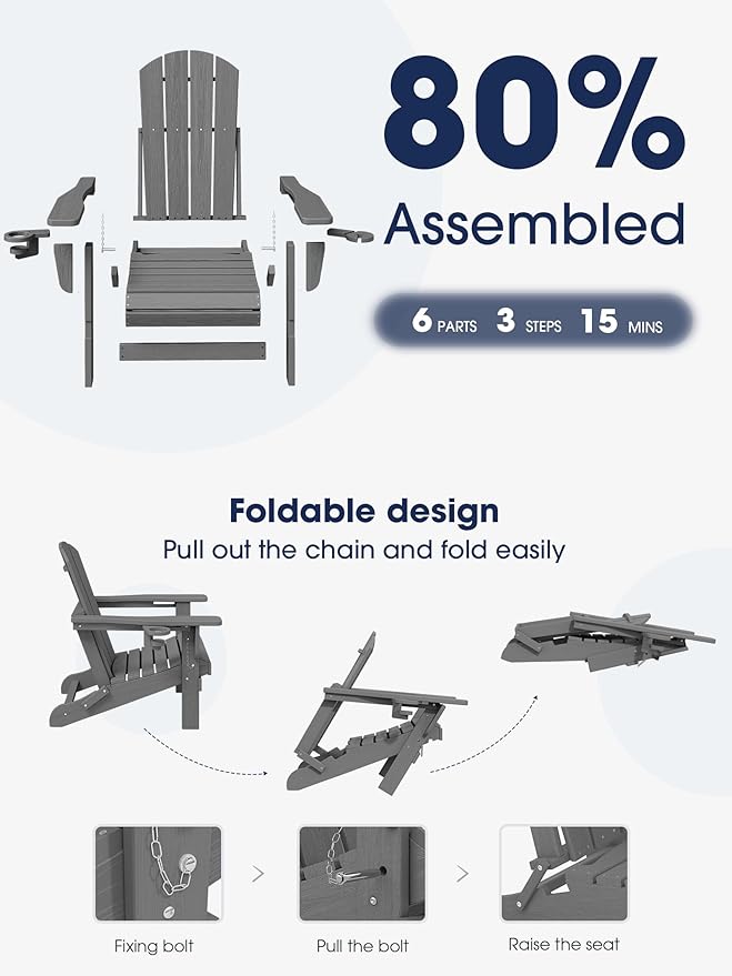 • Quick and Simple Assembly: Enjoy the convenience of a partially pre-assembled chair. Our adirondack chairs comes with 6 parts, clear instructions, and hardware. Assembly requires just 5 steps and 15 minutes.