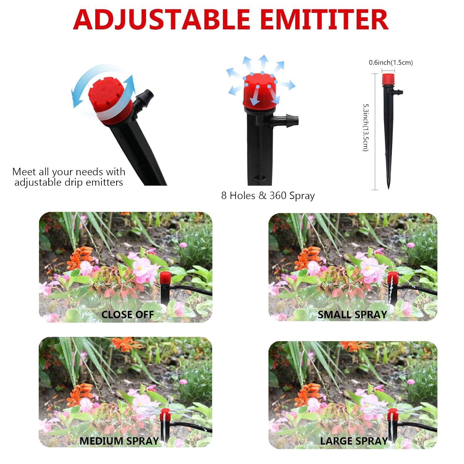 • 2 Kinds of Sprayers and Upgrade Tubing Design: Includes two sprayers (15 drip emitters and 15 vortex emitters ) that can be adjusted for different water flows. The main tubing is upgraded to a 1/2-inch diameter to support high water pressure. The 39.36FT main pipe can be cut in two, and two faucet connectors are included, allowing you to easily set up two drip irrigation systems as needed.