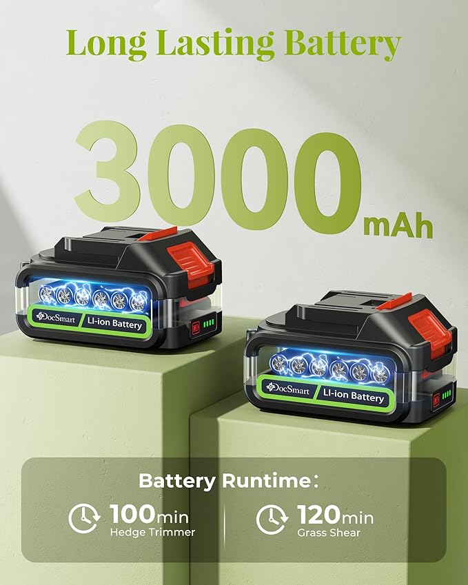 • One-hand Operation: DocSmart hedge trimmer comes short blade fully assembled with oil pre-coated to reduce wear and tear, simply plug in the fully charged battery and start using it. Ergonomic and non-slip handheld design ensures a comfortable grip and easy control. It can be used with one hand( 2.7 lbs), and it is not easy to get tired after long-term use. User-friendly for family and temporary work, even the elderly can easily control it